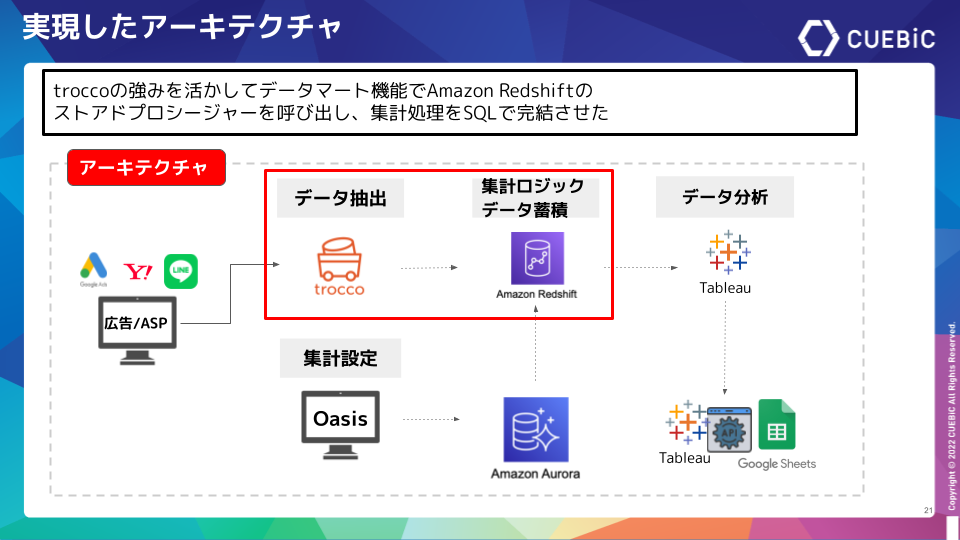 尾﨑勇太 氏:「先ほど示したキュービックアナリティクスの部分は、TROCCO®とRedshiftに置き換わった形で、集計の設定の部分だけがAmazon Auroraを経由しています。さらに、BIツールTableauから自動でデータ連携を行なっており、運用者は日々のデータをスプレッドシートに取り込むことができます。集計ロジックに関してはRedshiftのストアドプロシージャを採用することで、転送設定だけでなく、集計処理を簡素化するとともにSQL単独では実現が難しい複雑な集計もカバーできるようになりました。
