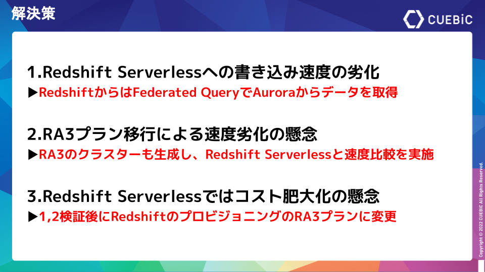 まず、Rubyのアクティブレコードへの書き込み速度の劣化に対してはRedshift Serverlessに集計に必要なマスタデータを持つことをやめ、Auroraに責務を移行しました。そしてFederated Queryを使用して外部スキーマを定義し、Auroraの情報をRedshift Serverlessから参照する形に変更しました。
