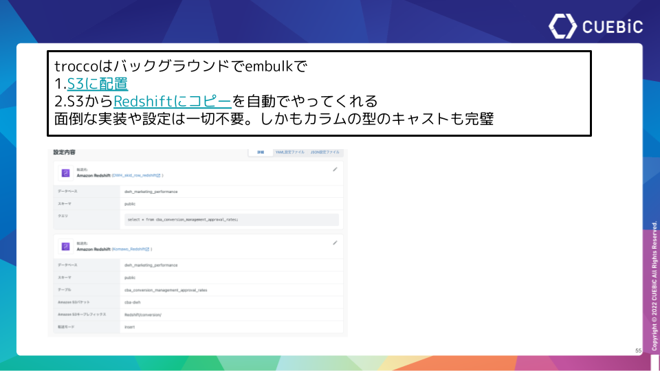今回はそのキュービック様が、TROCCO®の強みやTROCCO®とRedshiftを導入したときのエピソードに触れながら、成果集計処理を改善したコンテンツマーケティングの分析基盤構築についてお話しいただきました。