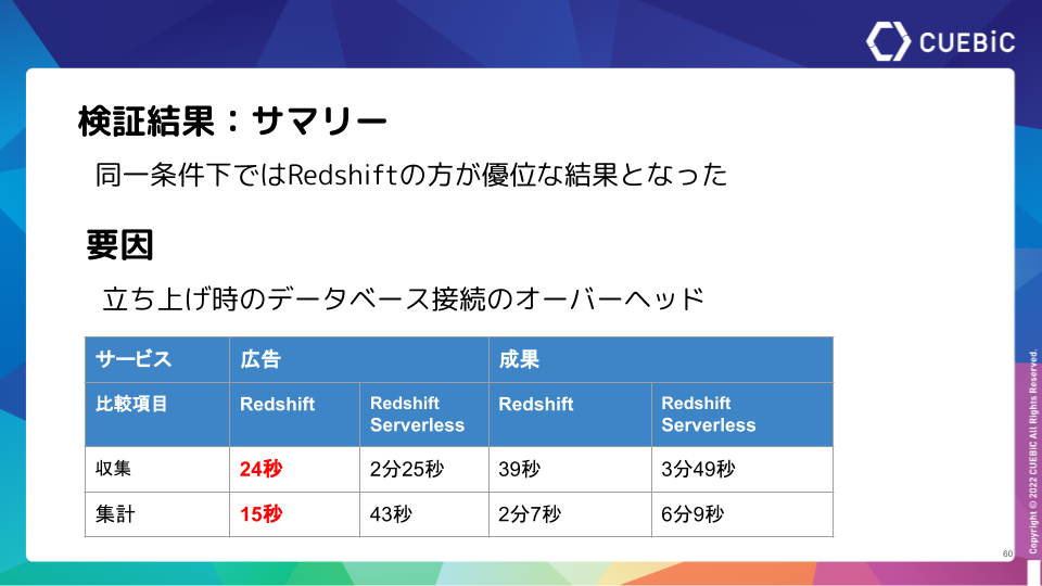 尾﨑勇太 氏:「データ移行後にTROCCO®のワークフロー機能で広告と成果のレポートの収集と集計の速度比較を行い、その結果、今回はRedshift RA3の方が優れたパフォーマンスを発揮しました。差分はデータベース接続のオーバーヘッドによるものなので、常時高負荷がかかるような処理の場合はRedshift Serverlessに軍配が上がる可能性が高いです。」