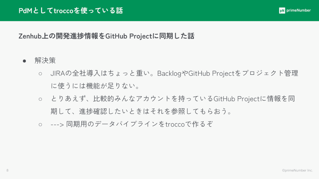 廣瀬 智史:「私がPdMとして入社してすぐであったためJIRAのようなツールをタスク管理に全社導入するのは大変で他の選択肢も微妙だったため、結果的には社内メンバーが基本的にアカウントを持っているGitHub Projectに情報を同期し、進捗を確認したいときだけ参照するというアプローチが有効であると考えました。プロジェクト管理はGitHubでは行わないということにしました。