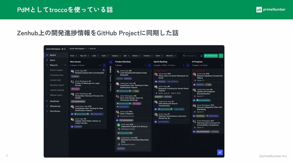 背景として、紹介した開発チームは、元々GitHubで開発タスクを管理していました。そこからチームが増えて、チームごとに開発を進めていくというときに、GitHubのissueをカンバン管理できるZenhubを導入した経緯がありました。