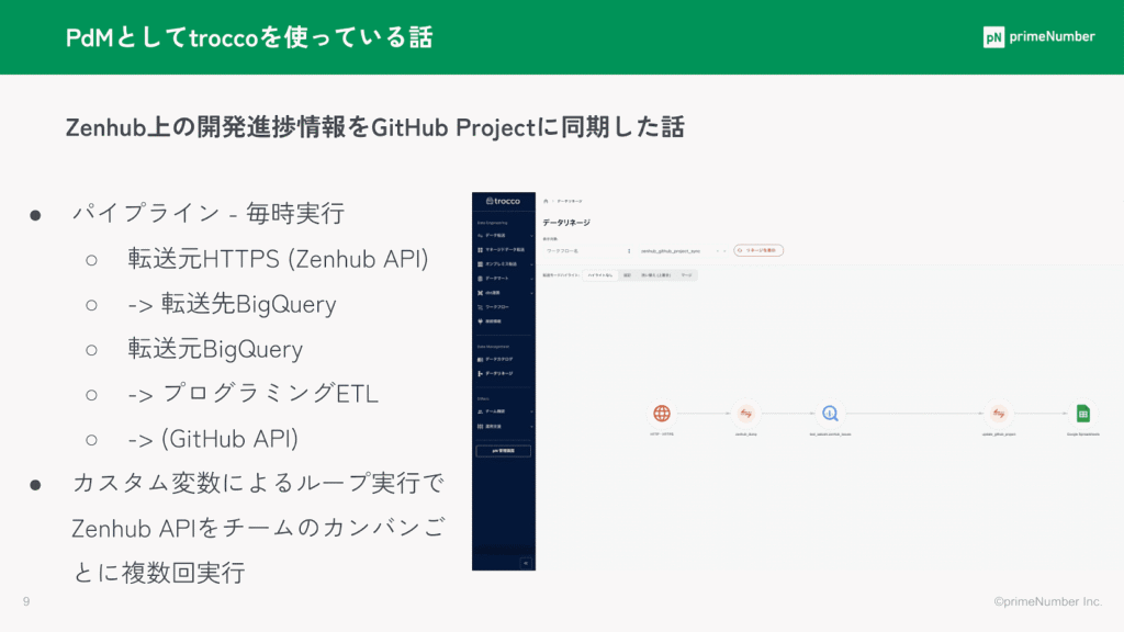 その後、転送元をBigQuery使用して先ほど追加したデータをBigQueryから取得し、プログラミングETLでGitHub APIをたたき、GitHubのプロジェクトを更新しています。」