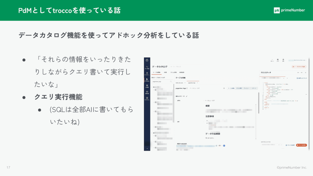そうした場合に、弊社が提供しているデータカタログ機能を活用して、クエリを書いてデータを利用しています。