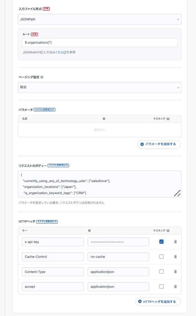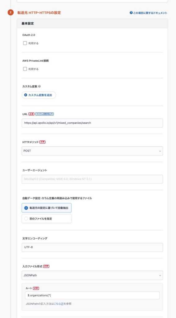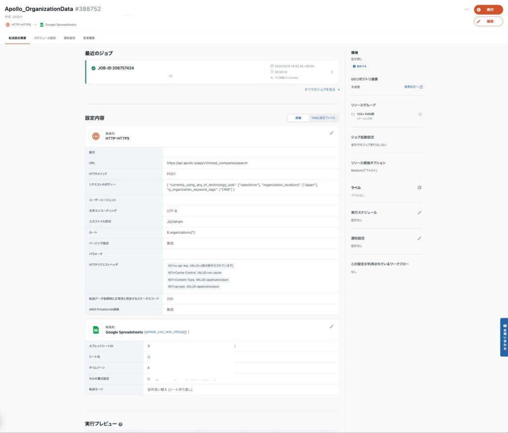 それでは、転送元HTTP・HTTPSコネクタを利用してApollo.ioの企業データを取得してみます。
