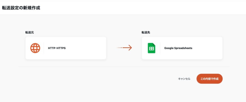 転送元で「HTTP・HTTPS」を選択し、転送先は今回「Google スプレッドシート」を選択します。
