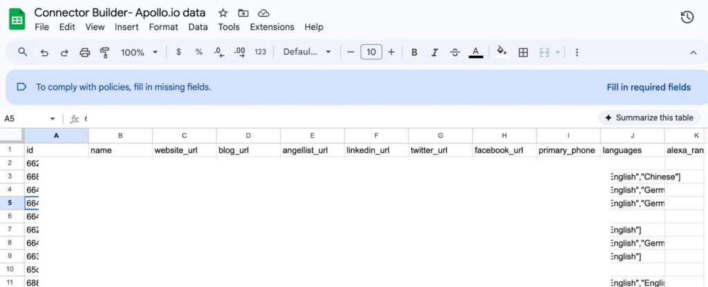 Google スプレッドシートにApollo.ioの企業データが転送できました!