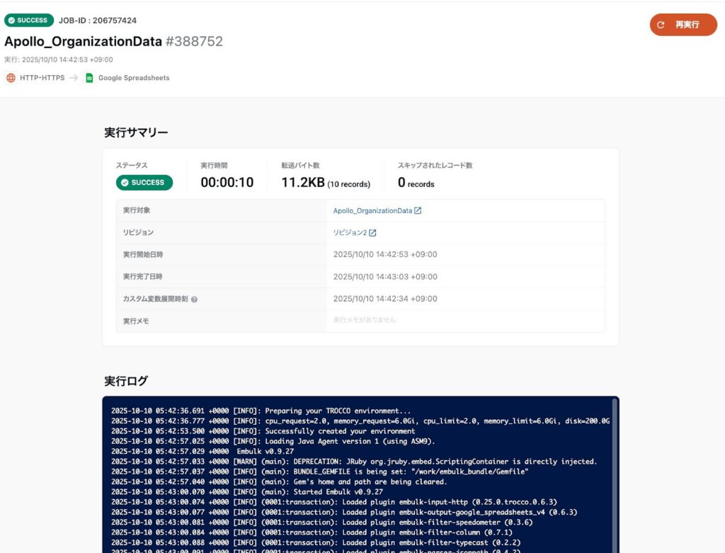 ジョブの実行ログ画面に切り替わり転送が開始されます。ジョブが正常終了するとステータスが [SUCCESS] に変更になります。