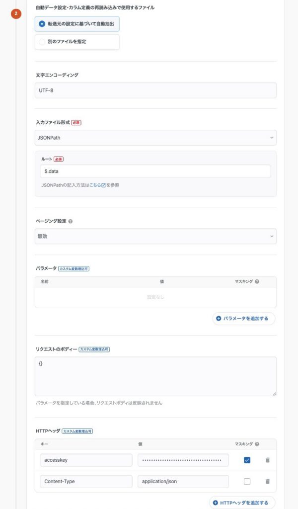 | HTTPヘッダ | 1行目キー:accesskey値:{取得したアクセスキー}2行目キー:Content-Type値:application/json |