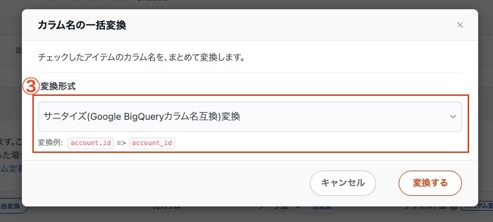 - 変換形式に「サニタイズ(Google BigQueryカラム名互換)変換」を選択し、「変換する」をクリックします