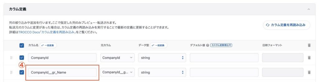- Gainsight CXの場合「CompanyId__gr.Name」のように参照した値が取得できますが、BigQueryのカラム名は”.”を許可していないため、このまま転送するとエラーとなります。