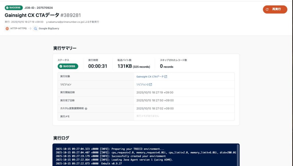 ジョブのログ画面でステータスが「SUCCESS」になれば、データ取得とBigQuery転送が正常に完了しています。