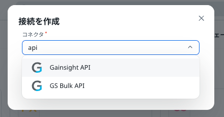 画面右上「接続を作成」をクリックし、「Gainsight API」を選択してください。