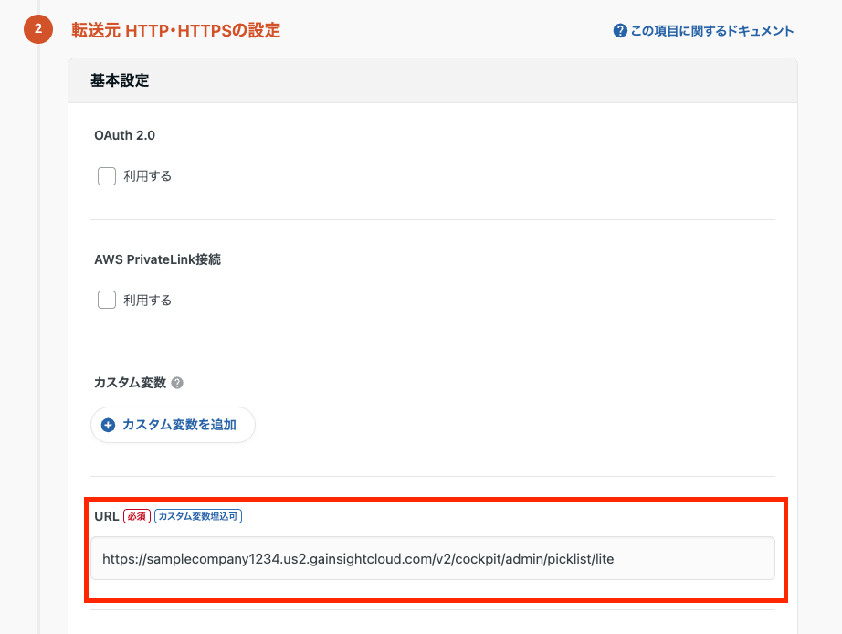 このエンドポイントURLと、契約しているGainsight CXのドメインを組み合わせた値を、HTTPコネクタの項目”URL”に入力します。