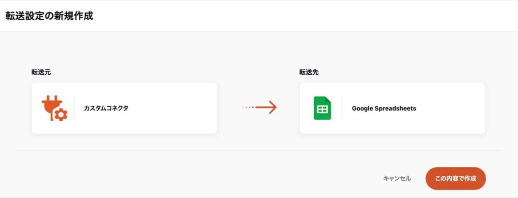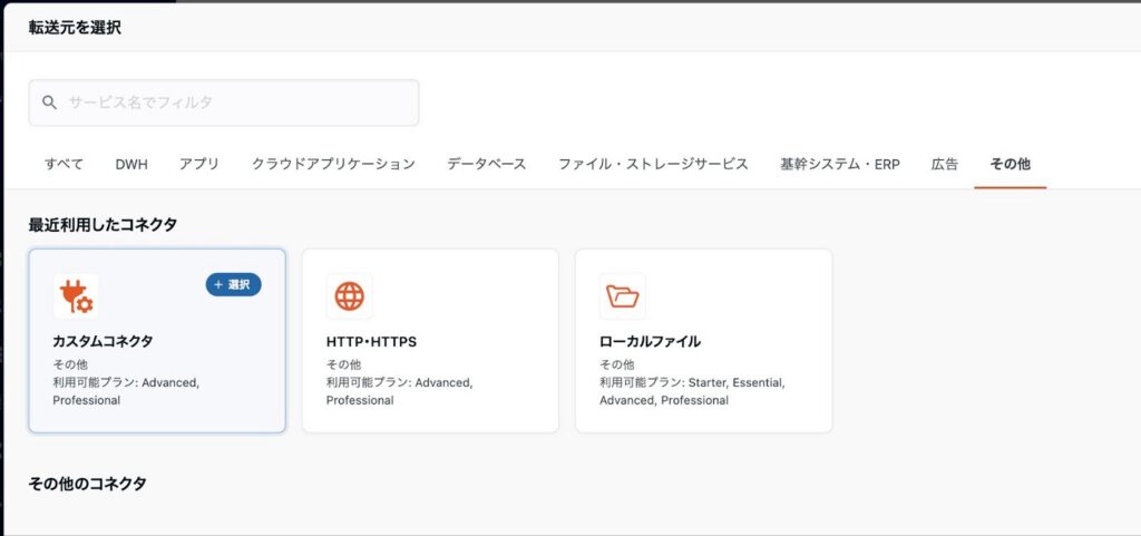 転送元と転送先を選択する画面が表示されますので、転送元をクリック、カスタムコネクタを選択します。