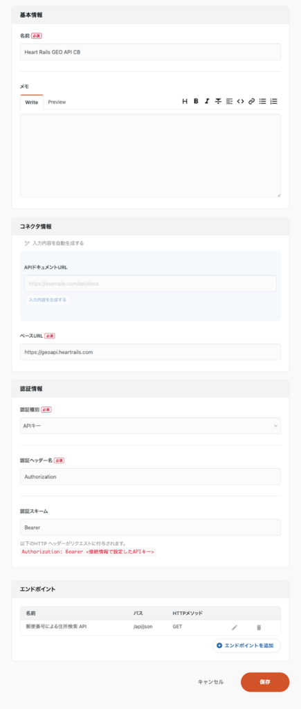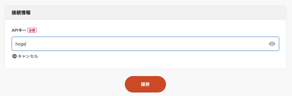 - APIキー:TROCCOのカスタムコネクタ接続情報にはAPIキーの入力が必須になっているため、適当な文字列を入力(例: hoge)して登録してください