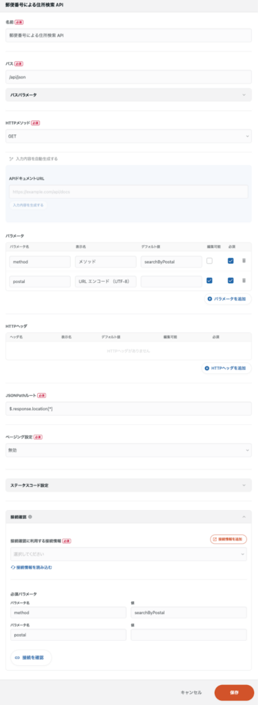 | パラメータ | ①パラメータ名: method表示名:メソッドデフォルト値: searchByPostal編集可能: チェックしない必須: チェックする ②パラメータ名: postal表示名: URL エンコード (UTF-8) された郵便番号デフォルト値: 空編集可能: チェックする必須: チェックする | 利用時に任意のクエリパラメータを指定してリクエストできるようにしたり、毎回固定パラメータでリクエストするなどの設定ができます |