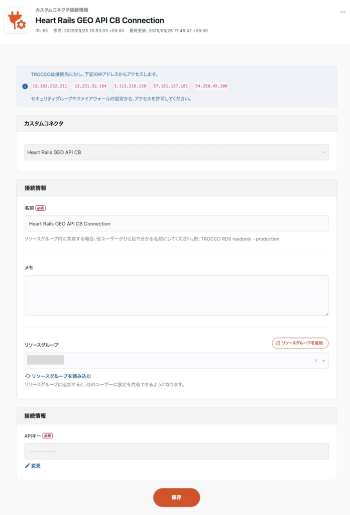 HeartRails Geo API は認証不要なAPIであるため、APIキーの発行の必要なく利用可能ですが、TROCCOでは認証なしを指定することはできないため、認証種別では「APIキー」を選択し、デフォルト入力値のまま保存します。