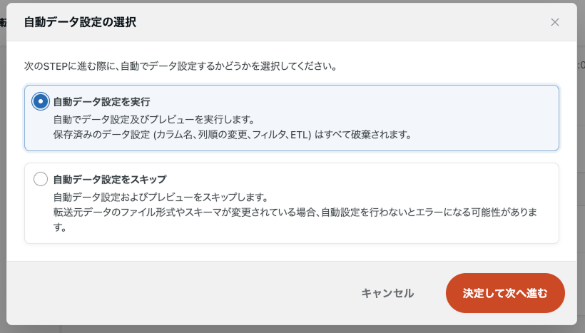 [次のSTEPへ] ボタンを押すと、自動データ設定の選択画面が表示されるので、[自動データ設定を実行]を選択したまま[決定して次へ進む]を押すと、スキーマのカラムマッピングが自動的に実行されます。