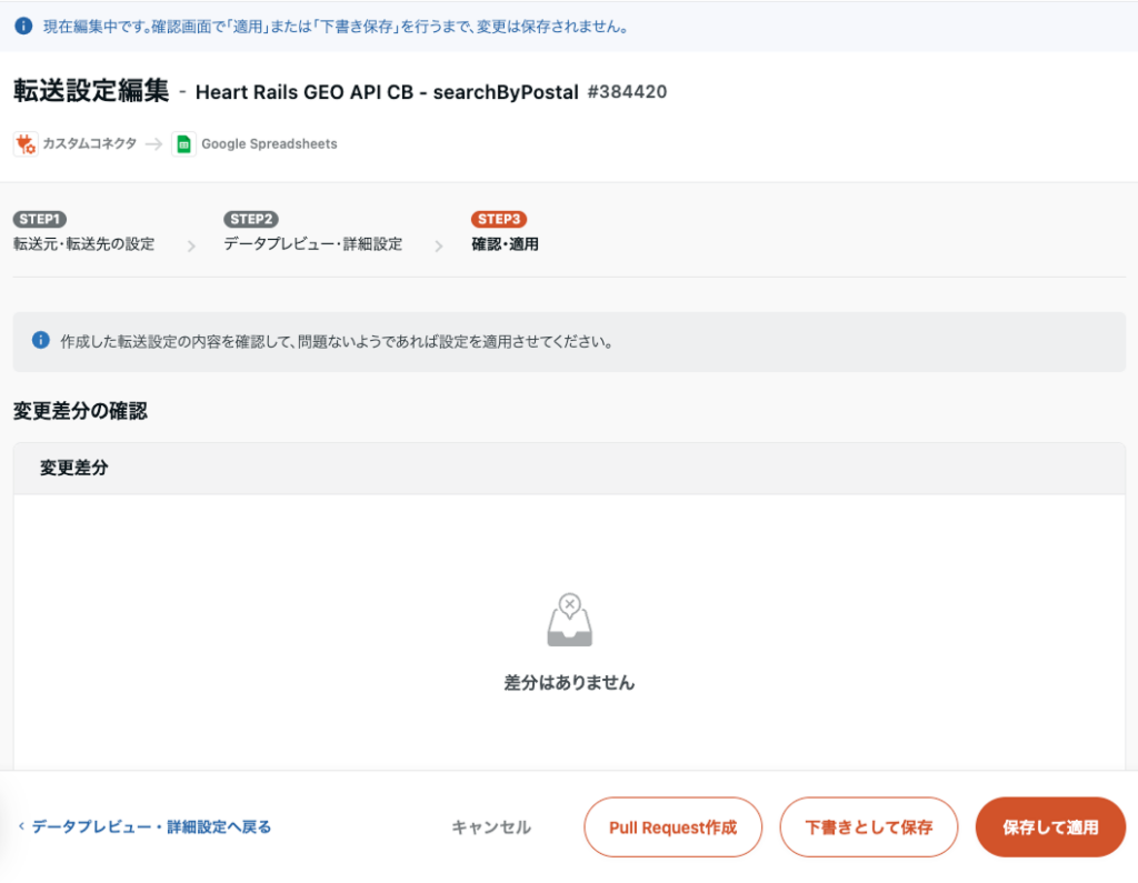 それでは、作成した転送設定を利用し実際にデータを転送するために、作成した転送設定の画面の右上にある [実行] ボタンを押します。