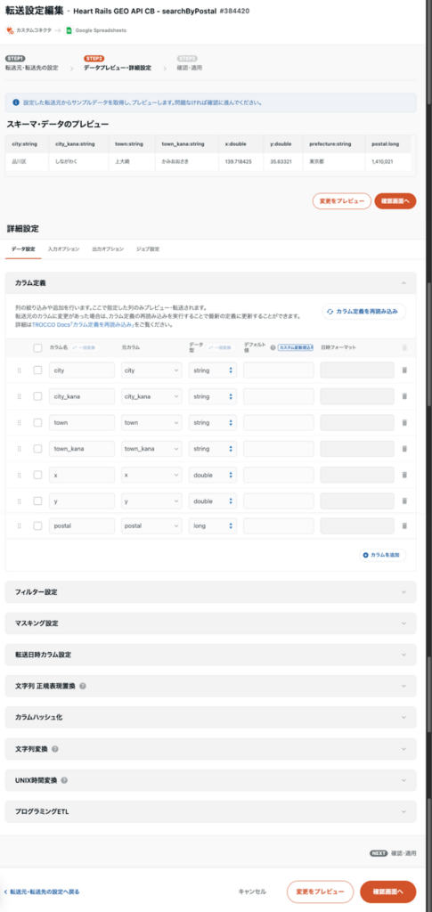 カラムの型推論とマッピング設定は自動的に行われますが、転送先のカラム名やデータ型はGUI上で任意に編集できます。