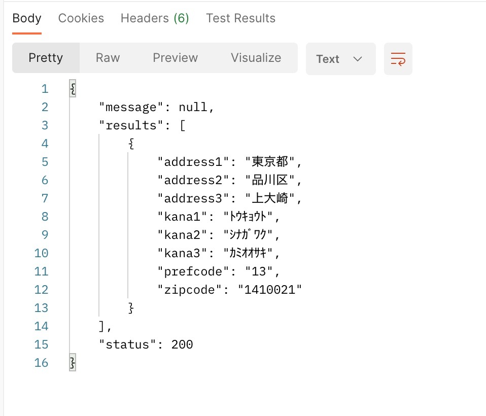 例えば、株式会社primeNumberの郵便番号である「1410021」を用いてAPIを実行すると、以下のようなレスポンスが返却されます。