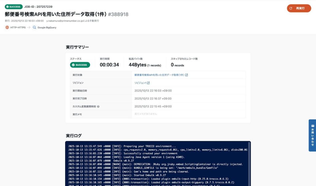これにより、郵便番号検索APIより取得した住所データをETLパイプラインの一部として組み込むことができます。
