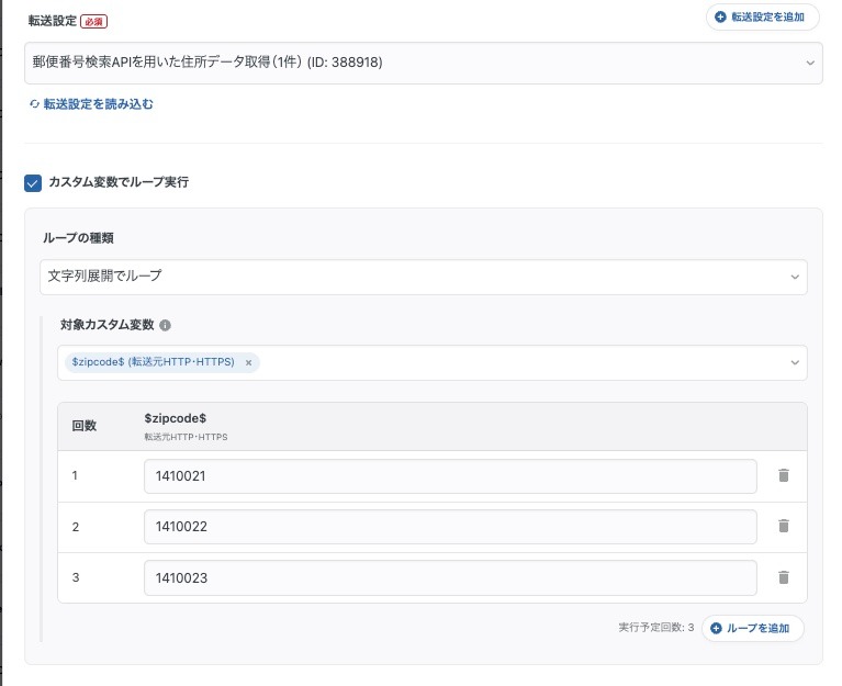 この場合、TROCCOではカスタム変数ループ実行を用いることで、複数の郵便番号ごとにまとめて住所データを連携することが可能となります。