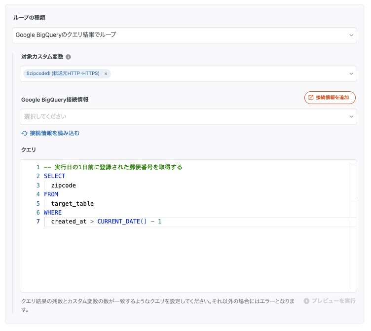 こちらを用いることで、例えば、既にBigQueryに連携された郵便番号をまとめて取得した後、ループ実行の変数として利用することも可能となります。このようにTROCCOでは、お客様のニーズに応じて柔軟なデータ取得を実現することが可能となっております。