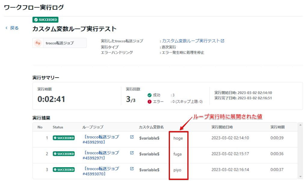 カスタム変数ループ実行では、タスクに埋め込んだカスタム変数に対して、複数の値を展開するよう設定できます。