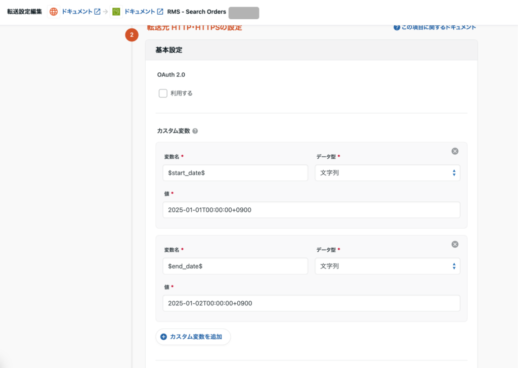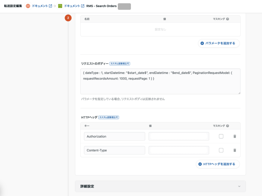まず、searchOrder エンドポイントを利用し、注文番号リストを抽出する設定を行います。