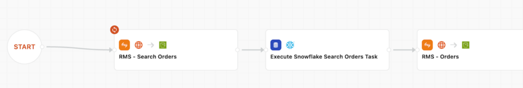 本構成では、searchOrder →(Snowflake Task)→ getOrder →(Snowflake Task) の順に処理を連携します。TROCCOのワークフローは次の 4ジョブ構成 です。