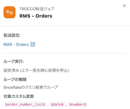 $order_number_list$は後述のカスタム変数ループでSnowflakeから読み出した100件の注文データの配列を差し込みます。