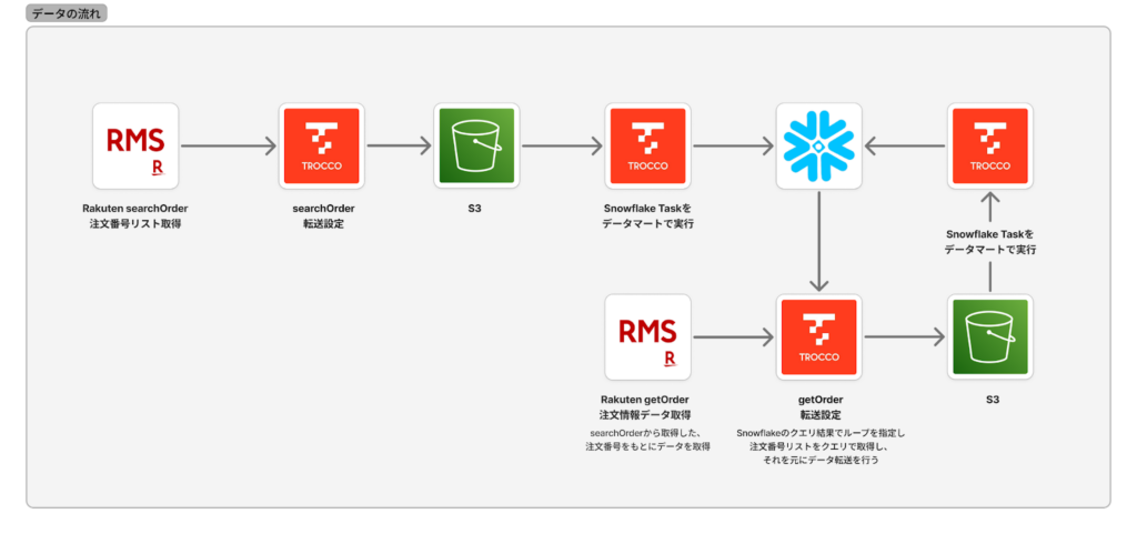- Snowflake上の注文番号リストを変数として getOrder に渡し → S3へ詳細を転送
