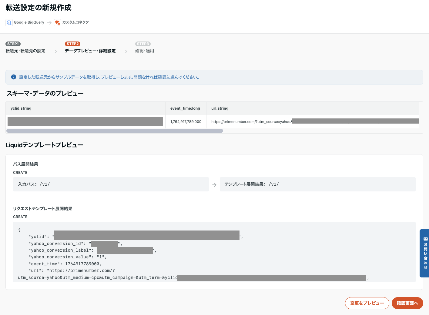 転送元のSQLでは、yclidが存在するレコードのみを抽出する、event_timeをUNIX時間に変換する、といった加工を行います。また、user_agentやipなど、APIで必須となるパラメータも転送元データに含まれている必要があります。