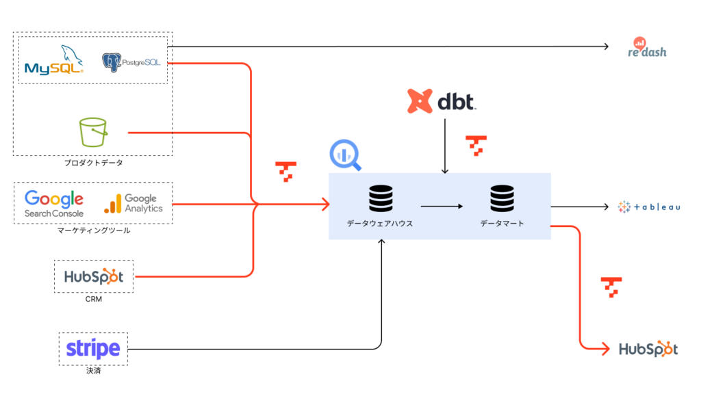 飯塚:まずプロダクトの転送元データとしてはMySQLとPostgreSQLです。マーケティングの転送元データでは、一部の事業部で使っているSalesforceやHubSpotを、リバースETLで一部のデータはHubSpotに転送していました。