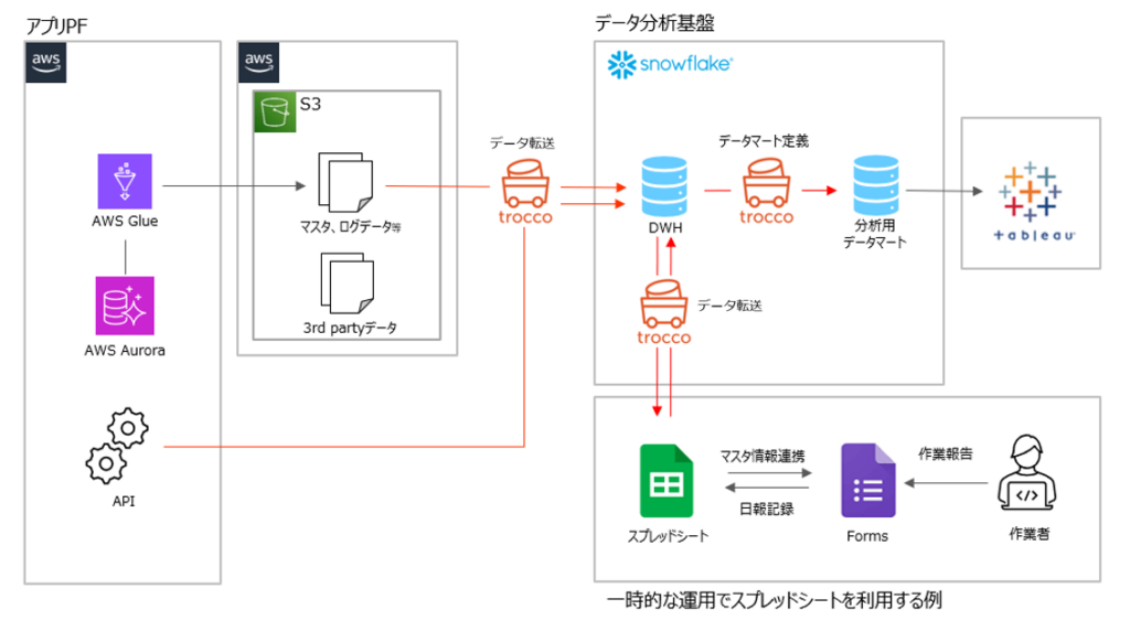 野口:セキュリティ面の問題でプラットフォームのデータには直接接続できない状況でした。プラットフォームのデータベースからデータを書き出し、それを利用するしか抜け道がなかったため、その前提でデータウェアハウスを作成する手段を考えなければなりませんでした。