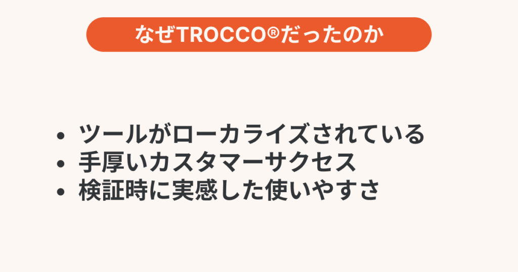 カスタマーサクセスの手厚さも、特に重視していた要素のひとつです。非エンジニアの社員がETLツールの操作に悩んでしまった場合、タイミングによってはサポートできない場面もあります。そこで「問い合わせフォームへただ誘導」するようなカスタマーサポートではなく、丁寧に「TROCCO®」の活用方法を説明し、場合によってはデータ活用のご提案までいただけるのは、とても助かると感じていました。