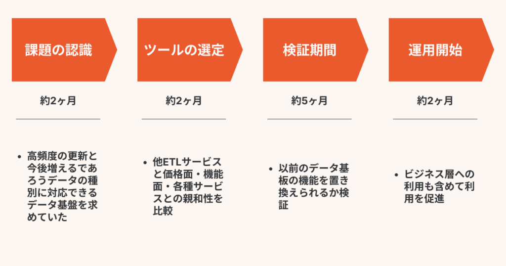 データウェアハウスの検証と合わせて4ヶ月のPoC後に本導入。データフロー機能とエラーメッセージ、リバースETLの機能を活用