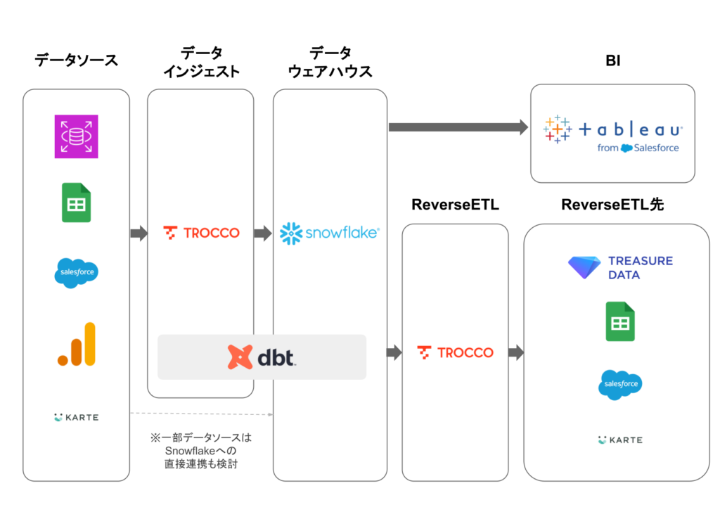 常住:まずはPoCとしてどのようなデータ基盤の構成が理想的か、4ヶ月ほどかけて検証しました。今回新たに導入した「TROCCO」とSnowflake、そしてdbt Cloudによるデータ基盤は、以前のデータ基盤でできていたことを置き換えることができるのか、データ基盤に必要なデータ連携元と連携先をしっかり網羅できているのかを確認しています。その他には、新しいデータウェアハウスの扱いやすさを、実際に触ってみて判断しました。