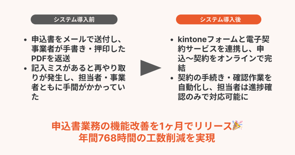 「暫定版CRM」からスタートし、成功を重ねた導入プロセス。申込書業務の機能改善を1ヶ月でリリースし、年間768時間の工数削減を実現。