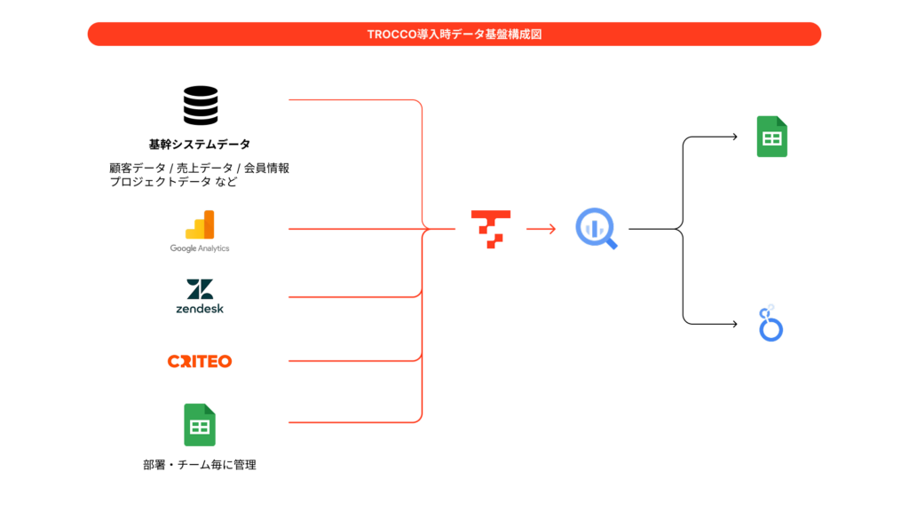 当社では元々、「TROCCO」とkintoneを別の用途で導入していました。「TROCCO」は基幹システムやGoogle Analyticsなど、サービスごとに分散していたデータをGoogle BigQueryに集約するために活用しています。