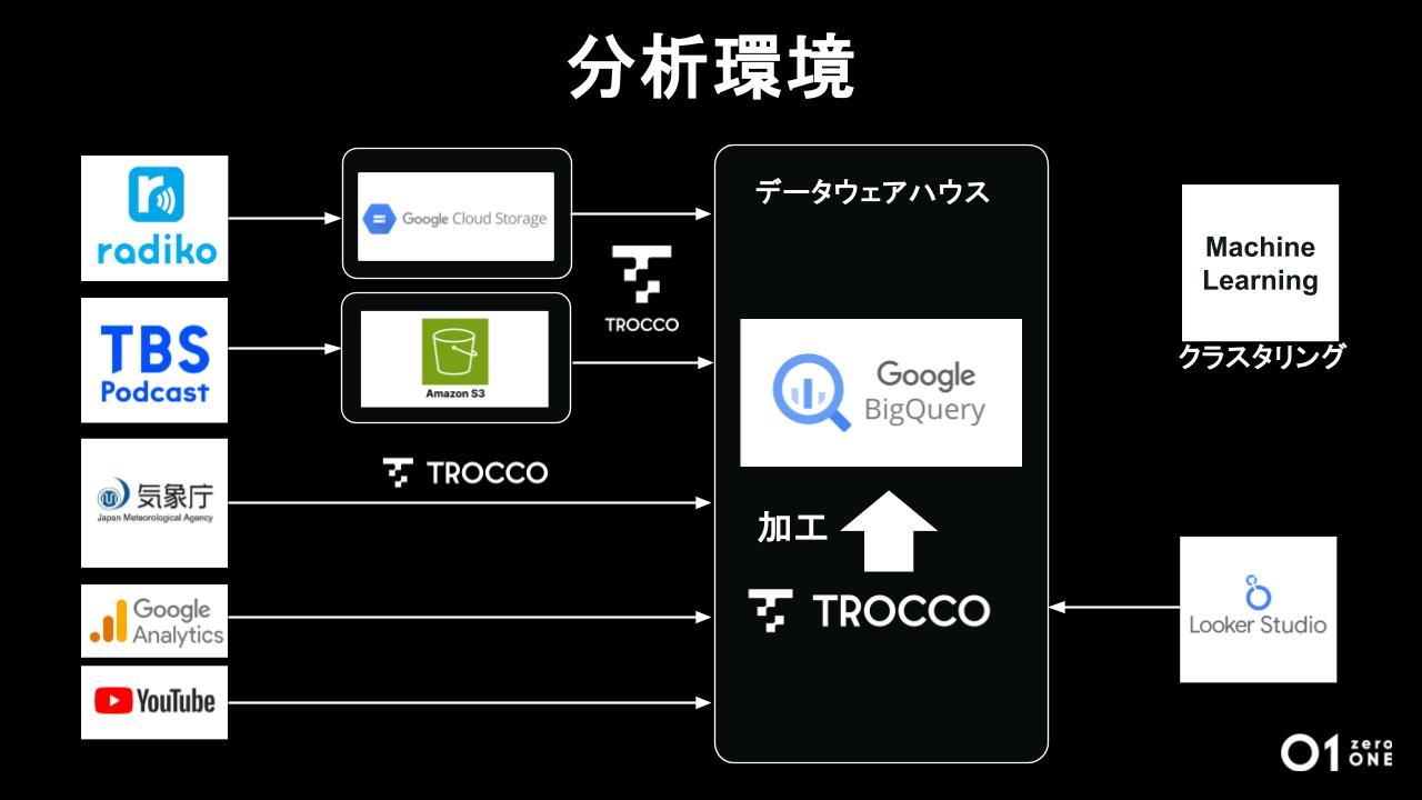 次に、radikoから取得できる聴取者の性別や年齢といった一般的なデータの他に『TBS Podcast』のデータやオープンデータ、Web上のデータ、YouTubeのデータなどをGoogle BigQueryに統合しています。そこからLooker Studioで可視化し、AIを活用して次のデータ活用につなげていくことができる基盤を構築いただきました。