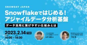 株式会社primeNumber(本社:東京都品川区、代表取締役CEO 田邊 雄樹)は、2023年2月14日(火)に開催されるイベント「SNOWDAY JAPAN」に参加します。14時からのオフライン・オンライン同時開催セッション「Snowflakeではじめる!アジャイルデータ分析基盤〜データ活用に繋げやすい仕組みとは〜」にて、ノバセル社のデータ分析基盤事例をご紹介します。また、オフラインのブース展示では、動画や資料を通じて、弊社サービス「trocco®」の機能・特徴をご紹介します。