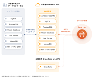 AWS PrivateLink(※1)を利用し、お客さまのAmazon VPC(※2)にtrocco®を接続します。お持ちのデータをインターネットに公開せず、データを統合することが可能となります(※3)。AWSとその他クラウドサービスを閉域網接続(※1)している場合は、それらに格納されているデータベースのデータ統合も、インターネットを介することなく実施可能です。![]()