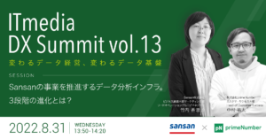 株式会社primeNumber(本社:東京都目黒区、代表取締役CEO 田邊 雄樹)は、2022年8月29日(月)から9月1日(木)にかけて開催されるオンラインイベント「ITmedia DX Summit Vol.13 変わるデータ経営、変わるデータ基盤」に協賛します。弊社は8月31日(水)13時50分からのセッションに登壇します。弊社サービスご利用企業のSansan株式会社によるデータ分析インフラの事例を紹介します。