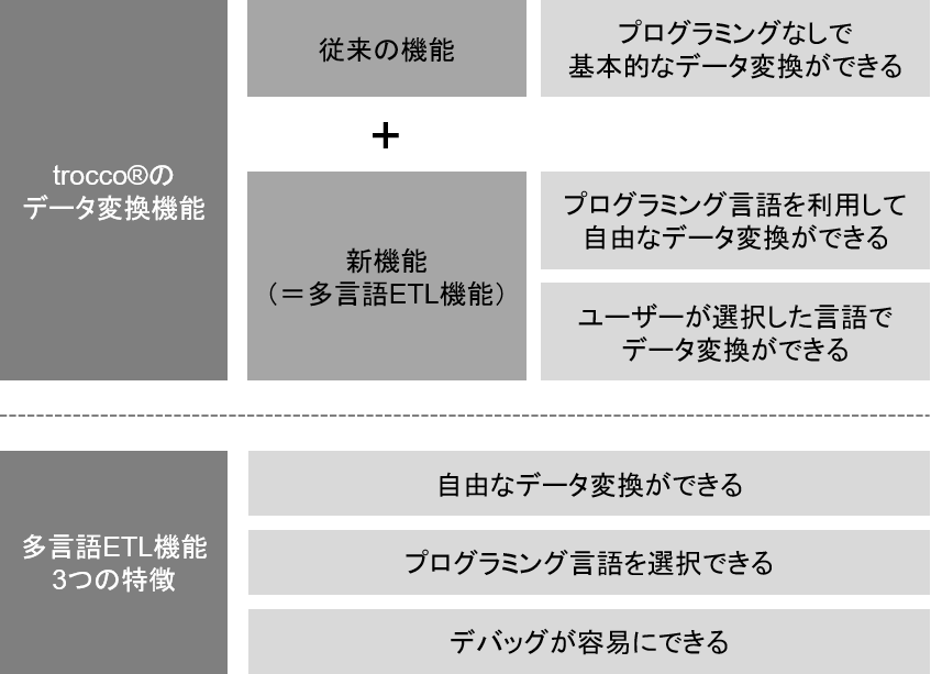 しかし、企業が持つデータの種類・量は爆発的に増え続けており、ユーザーが必要とするデータ変換のニーズも日々多様化しています。今回の機能追加は、自身の好みのプログラミング言語で、自社のニーズに合ったデータ変換をより自由に行いたい、というユーザーのご要望にお応えして実施致しました。