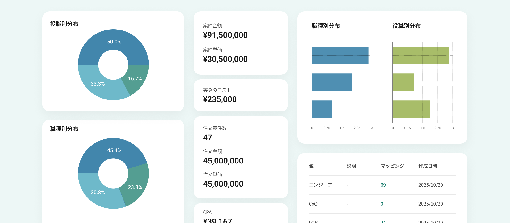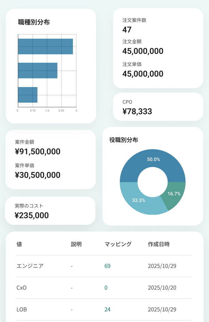 登録時にバラバラになった業種・職種・役職などの情報を、マーケティングに活用できる形へ自動でクレンジングします。分析の前準備にかかっていた膨大な工数を削減し、本来の戦略立案に時間を集中させることができます。