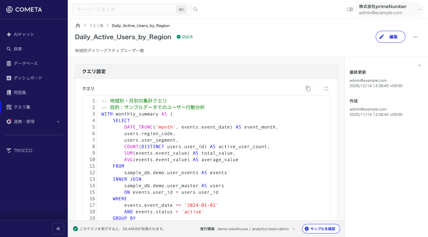AIとの対話UIを提供し、自然言語によるデータの探索や、目的のデータを取得するためのSQLの生成などをサポートするAI機能を組み込んでいます