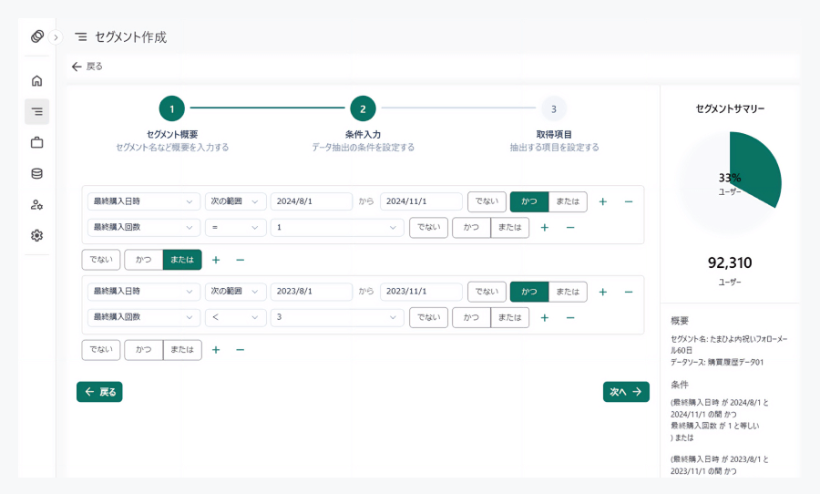 マーケ施策や分析に使える顧客セグメントをGUIで直感的に作成し、配信連携できるコンポーザブルCDPをクイックに整備します。非エンジニアでも扱えるユーザ体験により、施策立案やセグメント検証のPDCAを加速します。